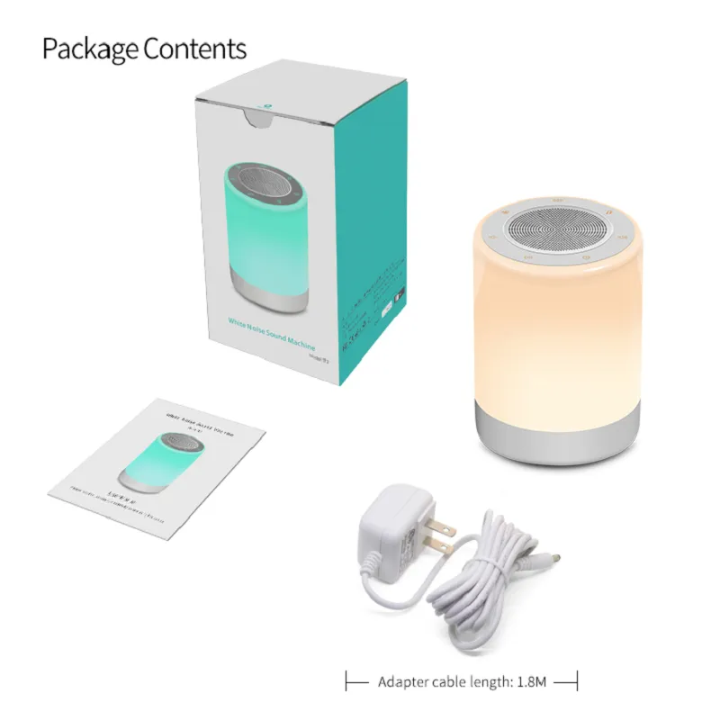ไฟนอนหลับมีเสียงสีขาว เสียงสีชมพู เสียงสีน้ำตาล เสียงพัดลม ฟ้าร้อง ฝนในแม่น้ำ คลื่นทะเล เปลวไฟ จิ้งหรีด กบ เสียงรถไฟ การเต้นของหัวใจ เพลงกล่อมเด็ก ฯลฯ เครื่องเสียงที่ดีพร้อมฟังก์ชั่นปิดเวลาการนอนหลับสำหรับทารก เด็ก และผู้ใหญ่ และใช้สำหรับให้นมบุตรและเปลี่ยนผ้าอ้อมในช่วงกลางคืน เพื่อผ่อนคลายเด็กๆ LED มี 7 สี ขาวสลัว ขาวสว่าง แดง น้ำเงิน เขียว ม่วง ส้ม